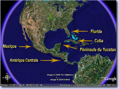 ** Isla Holbox, Mexique ** Pour mieux situer Isla Holbox, J'ai utilisé l'excellent logiciel Google Earth. J'ai ajouté quelques points d'intérêt. 6,700 Kilomètres d'altitude.